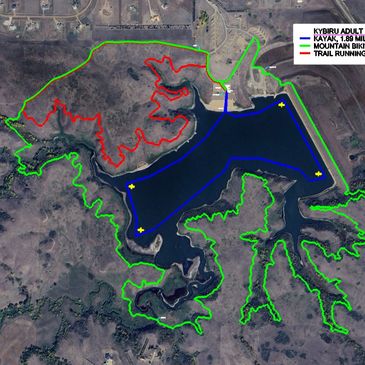 The start and finish will be at the same location. Start at the race tent and run to the awaiting kayaks (including paddles and life jackets). When you finished the water portion (blue) run to your awaiting mountain bike (and helmet) and change shoes if needed. Then do the mountain biking portion of the race (green). Put your bike in the rack and run the last leg of the race (red).
